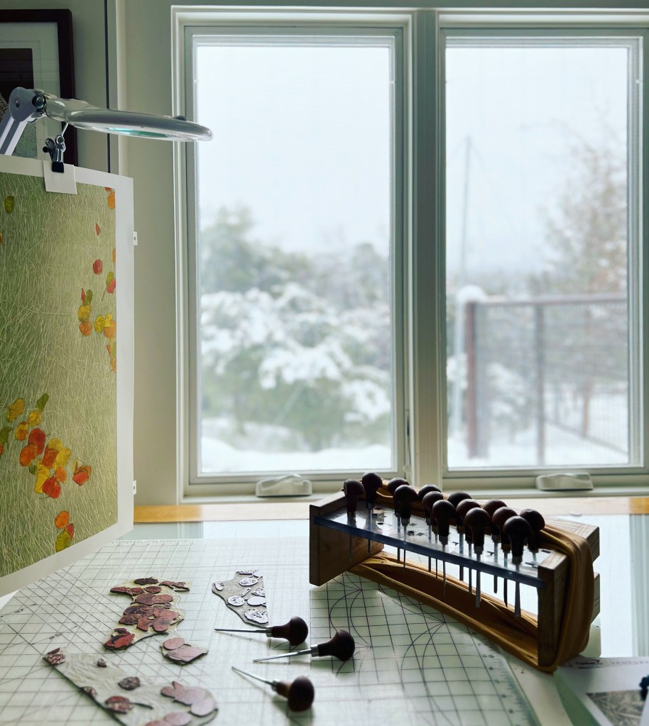 Red Tail Studios relief prints are made using wood blocks of various species (to make woodcut prints) or linoleum plates (to make linocuts). I use traditional Japanese carving tools to carve my original designs and print using traditional water-based pigments or oil-based archival inks onto archival quality paper for your lasting enjoyment. Images may be transferred by hand using a hand-held baren, but more often they are run through my much loved “Alice”, a vintage Laguna Etching Press owned by the 3rd female, Gold-Rush Country artist in a row! It’s quite a legacy!